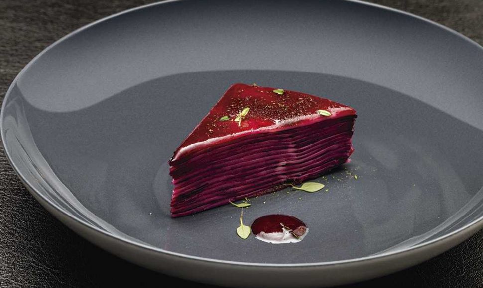 Une réinterprétation basque du millefeuille, composée de betteraves rouges et d'Ossau-Iraty, fromage typique de la région. Un hommage gourmand au terroir basque signé Akrame Benallal.