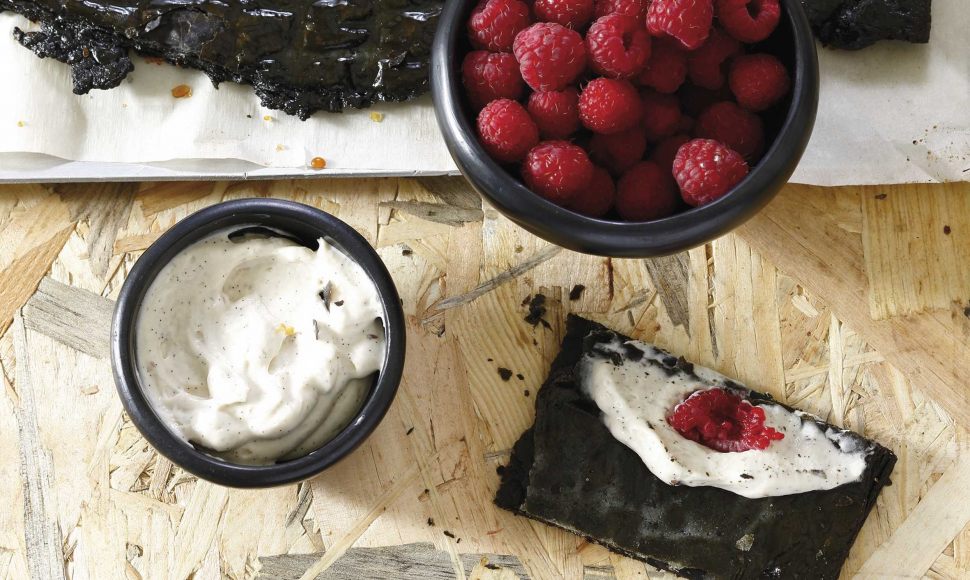 Un mille-feuille noir et déstructuré, revisité en mouillettes à tremper dans une Chantilly mascarpone et à accompagner de framboises fraîches.