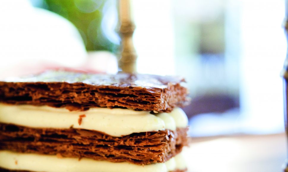Préchauffez le four à 200 °C (th. 7). Disposez le feuilletage entre deux plaques à pâtisserie en surélevant la plaque du dessus de 2 cm, à l’aide de quatre bouchons de liège taillés. Faites cuire environ 10 min au four. Au terme de la cuisson, sortez le feuilletage et augmentez la température à 240 °C (th. 8). Saupoudrez-le de sucre glace, puis enfournez à nouveau le temps de la caramélisation en surveillant attentivement : cette étape est très rapide. Sortez ensuite le feuilletage caramélisé du four et taillez des rectangles de 10 cm de longueur sur 5 cm de largeur, puis réservez.