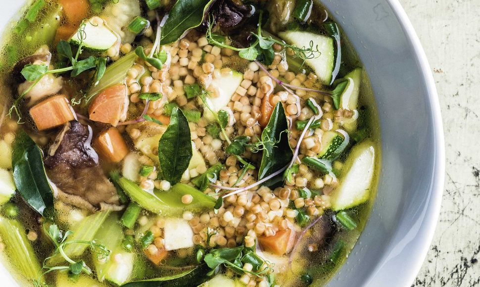 Un minestrone à base de fregola et de légumes : courgette, carottes jaune et orange, branche de céleri, haricots verts, petits pois, radis noir, champignons et brocolis avec du Grana Padano.