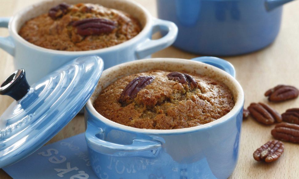 Dans un petit saladier, mélangez la farine complète avec le sucre, les épices, la levure et les noix de pécan concassées. Incorporez-les délicatement à la première préparation. Beurrez et farinez quatre mini-cocottes de 10 cm. Remplissez-les de pâte aux trois-quarts. Enfournez et laissez cuire 35 min. Baissez le four à 150 °C (th. 5) et laissez cuire encore 20 min. Démoulez une fois tiède. Servez avec une boule de glace aux noix ou une crème fouettée citronnée.