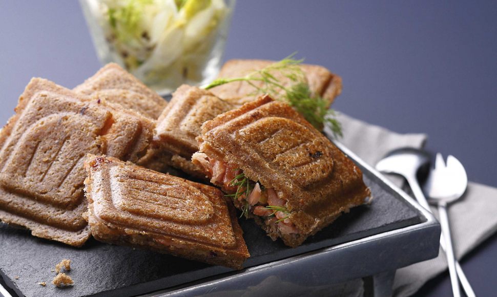 Des petits croque-messieurs au pain de seigle, saumon fumé, oignon, aneth et crème fraîche.