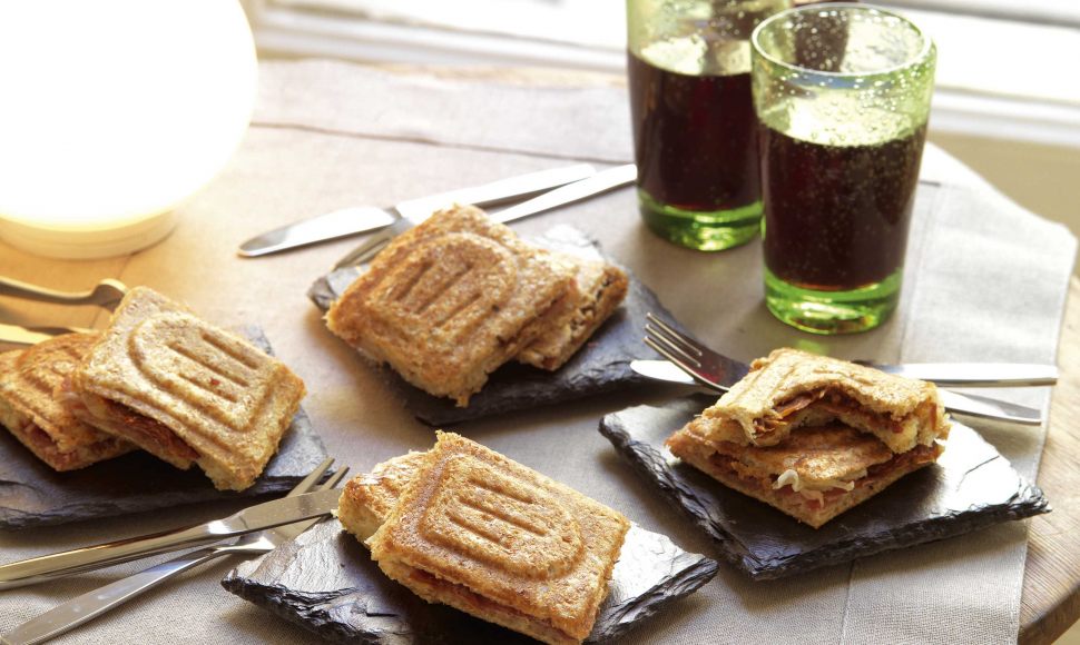 Des petits croque-messieurs façon italienne, à la tomate confite, mozzarella, jambon de parme et basilic.