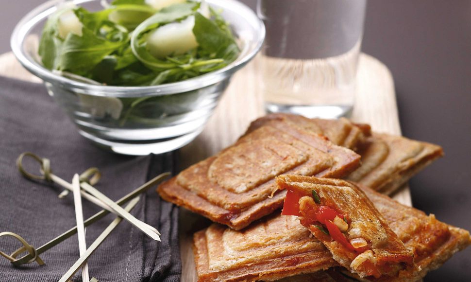 Des petits croque-messieurs à partager, au pain de campagne, poivrons, oignons, tomate, fromages et aromates.