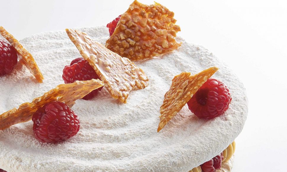 Versez la nougatine obtenue sur une feuille de papier cuisson et étalez-la le plus finement possible à l’aide d’un rouleau à pâtisserie. Une fois refroidie, brisez la moitié de la nougatine et concassez-la finement. Conservez l’autre moitié intacte pour la finition. Réservez le tout.