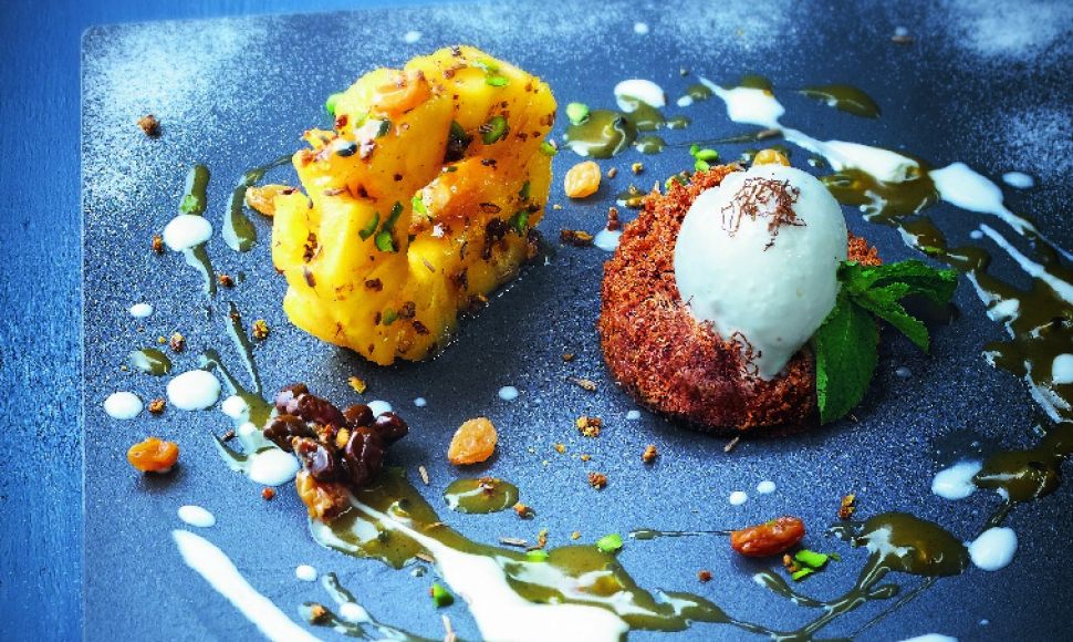 "J'ai voulu recréer dans ce dessert la sensation que j'avais en prenant une bouffée de cigare Monte-Cristo n°5 et une petite goutte de poire Brana. Une sensation à la fois acidulée et exotique. L'esprit des Caraïbes me semblait évident : coco, Passion, pain d'épices, vanille, ananas et épices. J'ai réussi à recréer cette sensation grâce à la construction aromatique."