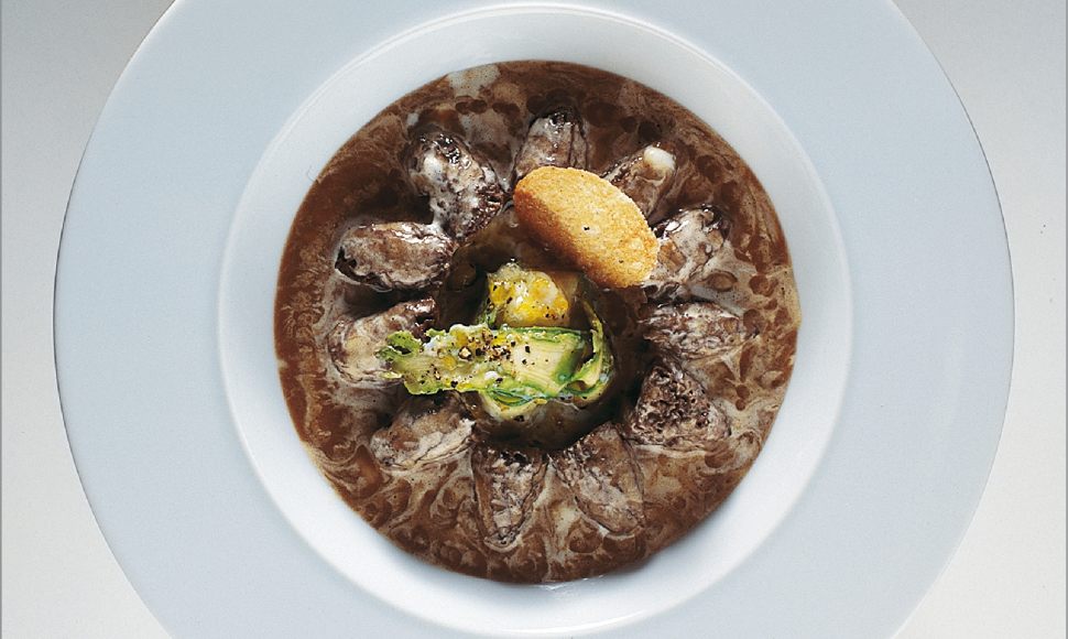 Faire suer au beurre l’échalote hachée finement et incorporer les parures de morille. Faire suer à nouveau, ajouter le bouillon de pot-au-feu et cuire à couvert durant 20 minutes. Mixer à chaud à l’aide d’un thermomixeur, puis passer au tamis de soie.