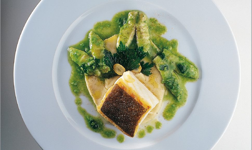 Morue de bilbao et kokotxas comme au pays basque, purée de cocos du val nervia au romarin, copeaux d’ail blonds