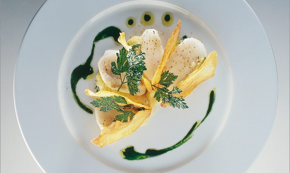 Morue de bilbao pochée et effeuillée brandade au persil plat, très fines chips de pomme de terre