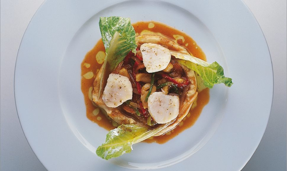 Morue de bilbao pochée, purée de pois chiches, délicat ragoût de tripettes de stockfisch aux perugina