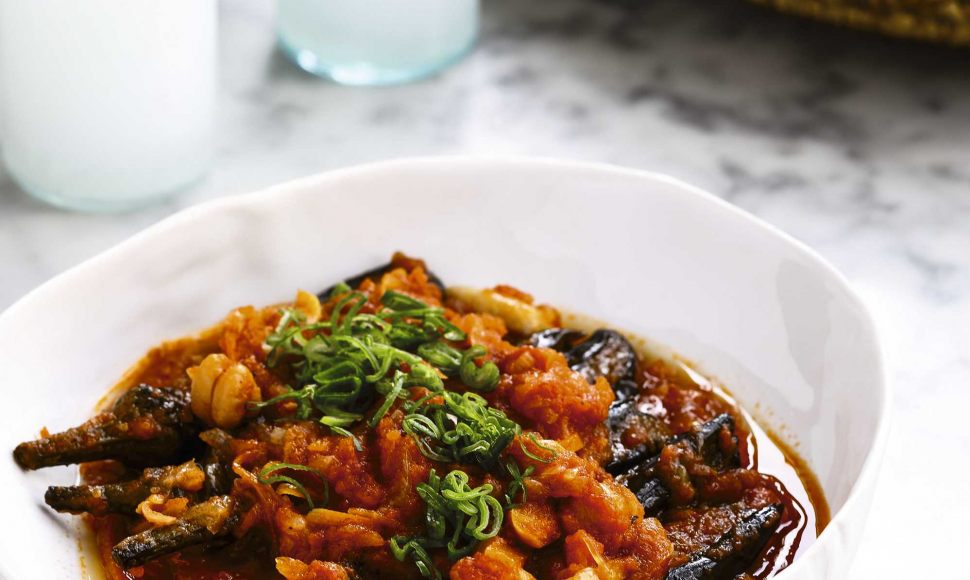 La veille, épluchez les aubergines et taillez-les en gros morceaux de 40 à 50 g. Si vous utilisez de petites aubergines, épluchez-les dans le sens de la longueur en prenant soin de garder une bande de peau sur deux pour qu’elles ne s’effritent pas. Coupez-les en deux dans le sens de la longueur pour faciliter le dégorgement. Recouvrez-les généreusement de gros sel et laissez-les dégorger dans une passoire pendant une nuit. Mettez les pois chiches à tremper dans l’eau toute la nuit.