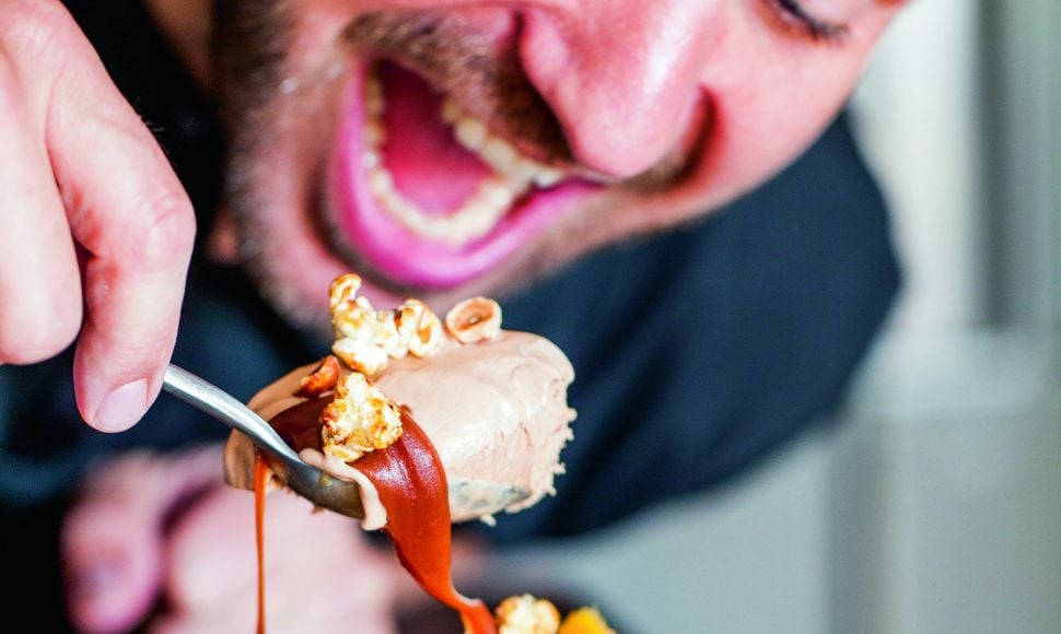 Une délicieuse crème glacée au caramel et à l'orange agrémentée de noisettes et de pop-corn caramélisé.