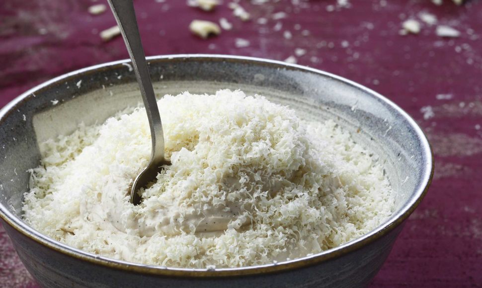 Une mousse marron-vanille douce et onctueuse, recouverte de chocolat blanc râpé.