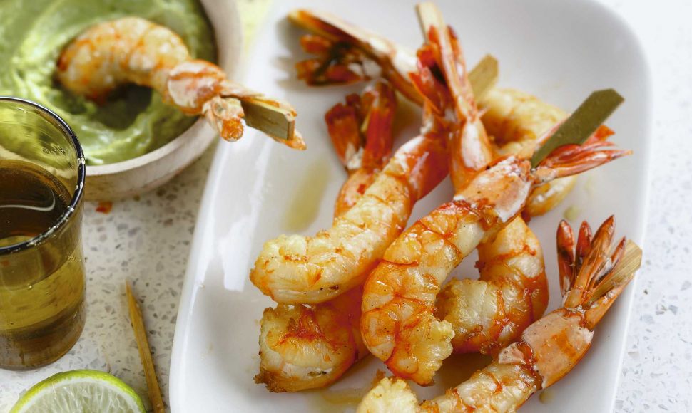Décortiquez les crevettes en conservant la queue. Retirez les boyaux par une incision fine à la queue en tirant à l’aide d’une pointe de couteau. Piquez chaque crevette sur une petite brochette en bois.