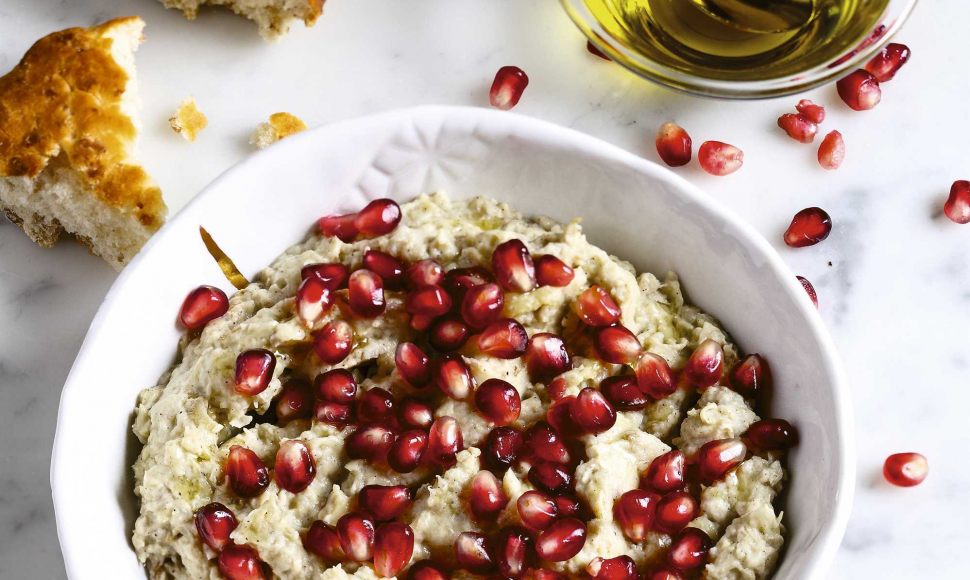 Moutabbal : purée d’aubergines grillées, crème de sésame et graines de grenade