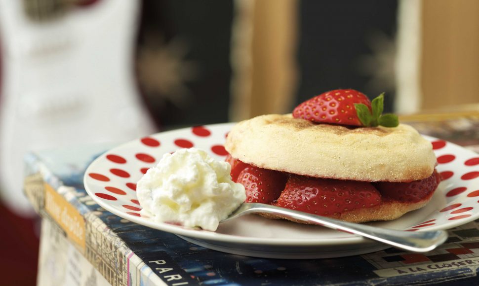 Un muffin anglais légèrement grillé, garni de fraises en morceaux et en confiture, accompagné d'une crème chantilly.