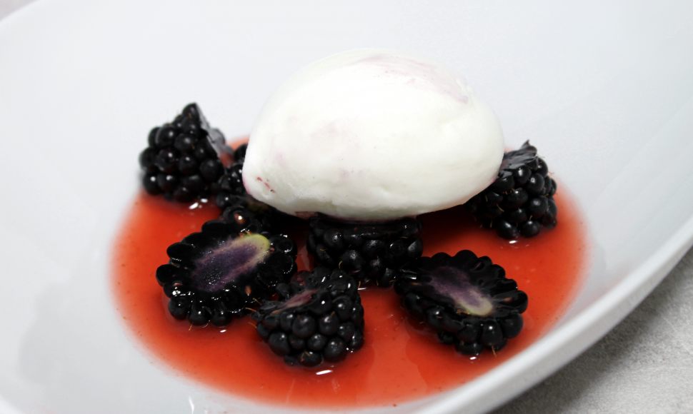 Mûres au jus de fraises tiède, sorbet mascarpone