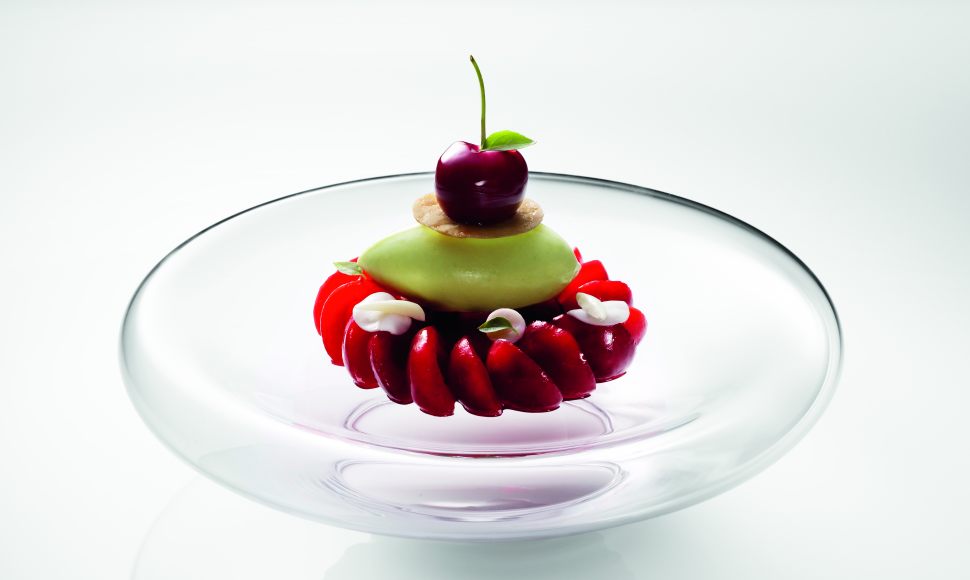 En utilisant des griottes en marmelade, on a le côté acidulé de la cerise tandis que la burlat pochée, avec une touche d’épices, a une note plus sucrée. Le fruit montre ainsi toutes ses facettes, façon bonbon acidulé rafraîchi par le basilic : parfait en plein été.