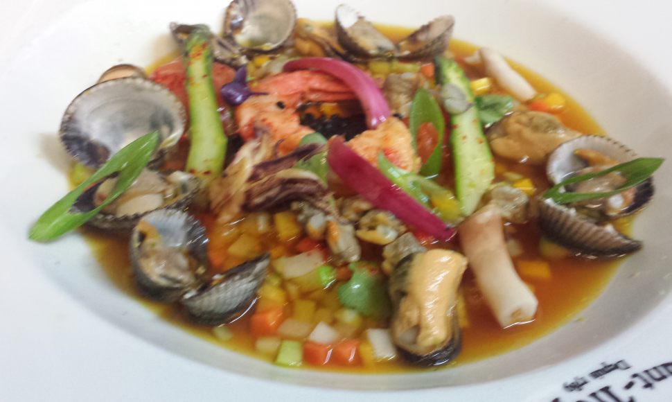 Dans une poêle chaude avec un léger filet d'huile d'olive, faites sauter les gambas salées et poivrées une minute de chaque côté. Ajoutez les légumes et les coquillages décortiqués 1 minute puis disposez dans les assiettes harmonieusement.