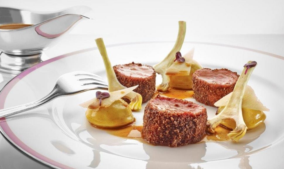 Noisettes d’agneau en croûte d’olive, ravioles d’artichauts violets, copeaux de parmesan et artichauts crus