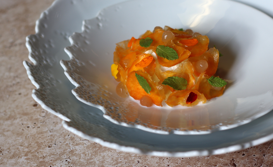 Équilibrée, surprenante et terriblement gourmande, cette création de Moulaye Fanny marie la douceur aérienne d’une mousse à la noix de coco avec l’acidité raffinée d’un gel de tamarin et la rondeur d’un biscuit de patate douce. Un dessert tout en contrastes, où chaque texture et chaque saveur trouve sa place pour composer une bouchée à la fois délicate, chaleureuse et dépaysante. Une invitation à voyager, portée par la sensibilité et la créativité du chef.