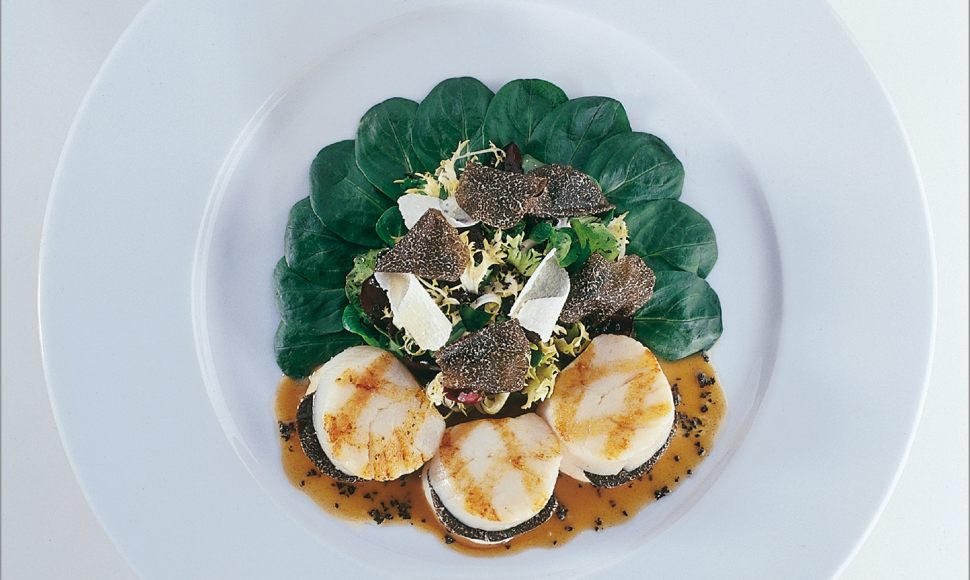 Noix de coquille Saint-Jacques grillées sur la braise en salade d’hiver aux truffes noires