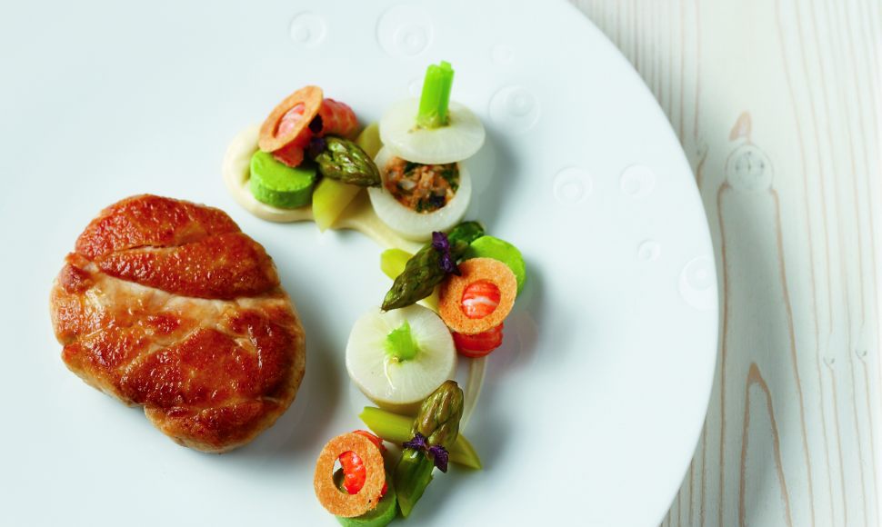 Noix de ris de veau croustillantes, asperges vertes et navets confits, crème d'écrevisses