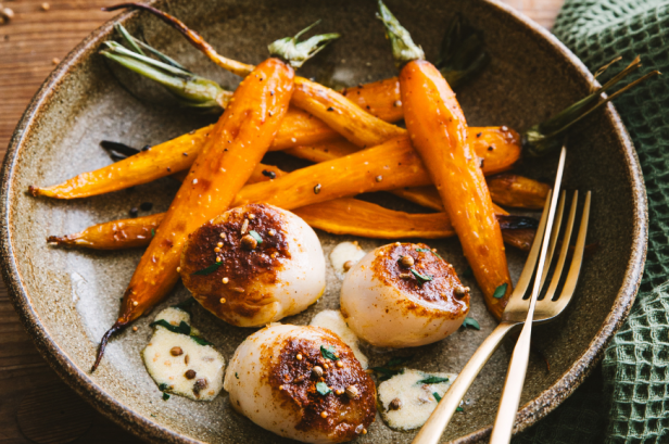 Disposer 3 noix de Saint-Jacques par assiette, ajouter des carottes confites et un cordon de sauce.