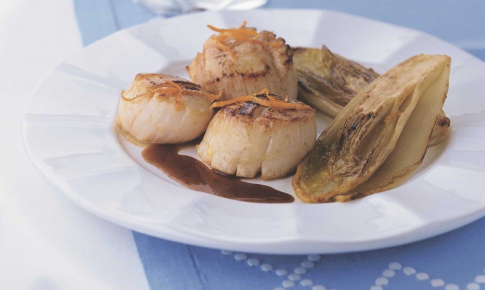Des noix de Saint-Jacques accompagnées de sucs de daube au bœuf et beurre d'agrumes. Un plat à servir avec des endives braisées.