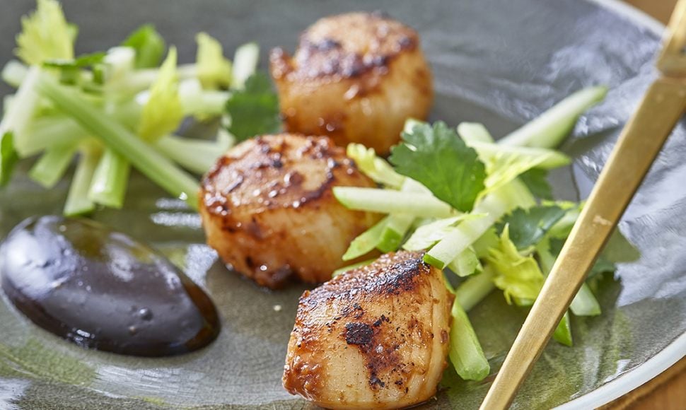 Mélanger la pâte miso avec le vinaigre de riz et le sucre, puis badigeonner les noix de Saint-Jacques de la baie de Saint-Brieuc avec ce mélange.