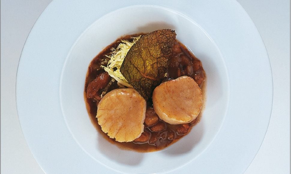 Napper généreusement le fond de grandes assiettes creuses de jus aux châtaignes cassées et disposer les Saint-Jacques. parsemer de sel de bacon.