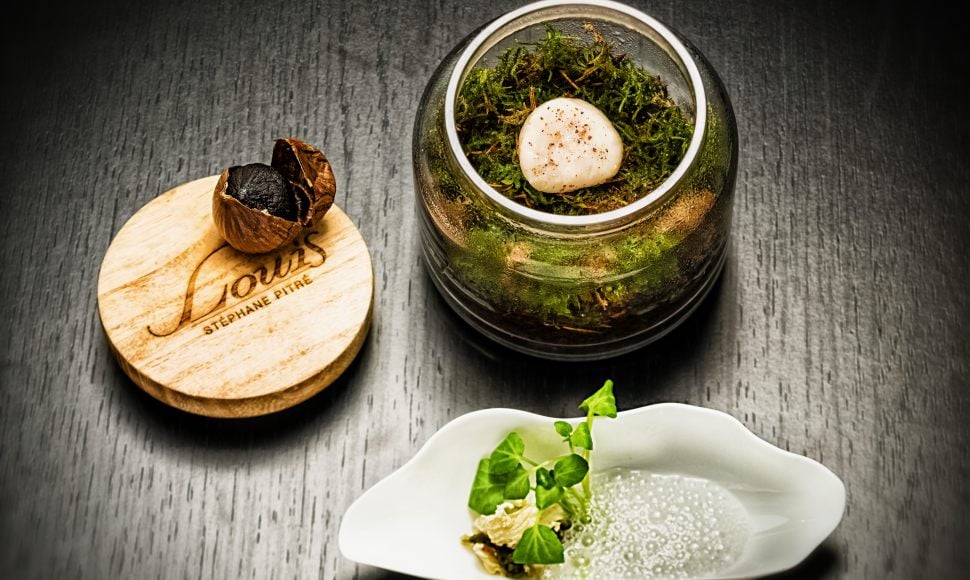 Noix de Saint-Jacques, voilée d’une vapeur de lichen, arrosée d’un bouillon clair de ses bardes, parfum de citronnelle