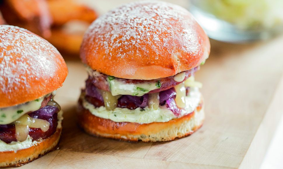 Faites chauffer une poêle. Ajoutez l’huile et laissez colorer le cervelas. Coupez les pains en deux et faites-les toaster sous la salamandre. Tartinez finement de faisselle la partie inférieure des pains. Coupez le comté en bâtonnets et posez-les sur la faisselle. Laissez fondre doucement sous la salamandre. Déposez une tranche de cervelas. Étalez un quart de c. à c. de marmelade d’oignon entre la première et la deuxième tranche. Déposez 1 c. à c. de sauce dijonnaise et couvrez avec les chapeaux. Mélangez les pommes de terre avec les rondelles d’oignons en tempura. Servez 2 burgers par personne dans un petit sachet en papier. Servez la sauce dijonnaise, les pommes de terre et la salade à part.