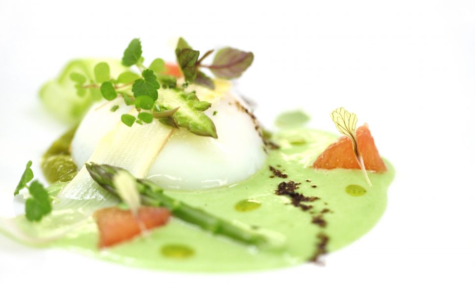 Une recette toute en fraîcheur pour se mettre en appétit : œuf, asperges vertes et pamplemousse par le jeune chef Gaëtan Gentil.