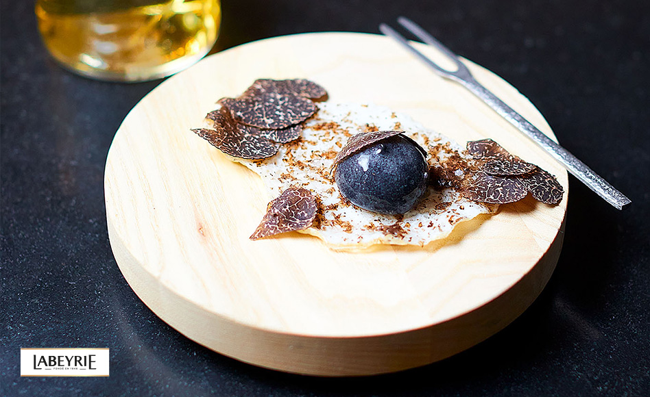 Quand l’œuf touche la surface de la poêle, glissez l'embout de la pipette vide sous la membrane du jaune d’œuf puis retirez-en deux tiers. Glissez ensuite la pipette remplie de jaune et de brisures de truffes et remplissez-en de deux tiers.