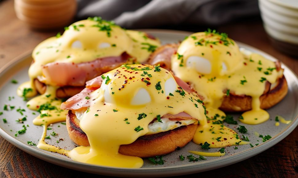 Un classique du brunch américain, préparé avec l'une des sauces phare de la cuisine française : des oeufs mollets recouverts de sauce hollandaise, parfaits pour le petit-déjeuner ou le brunch.