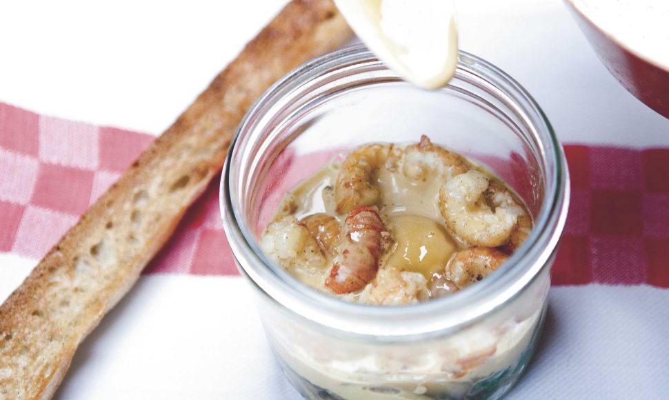 Des œufs cocottes avec une sauce à l'écrevisse et fricassée de champignons.
