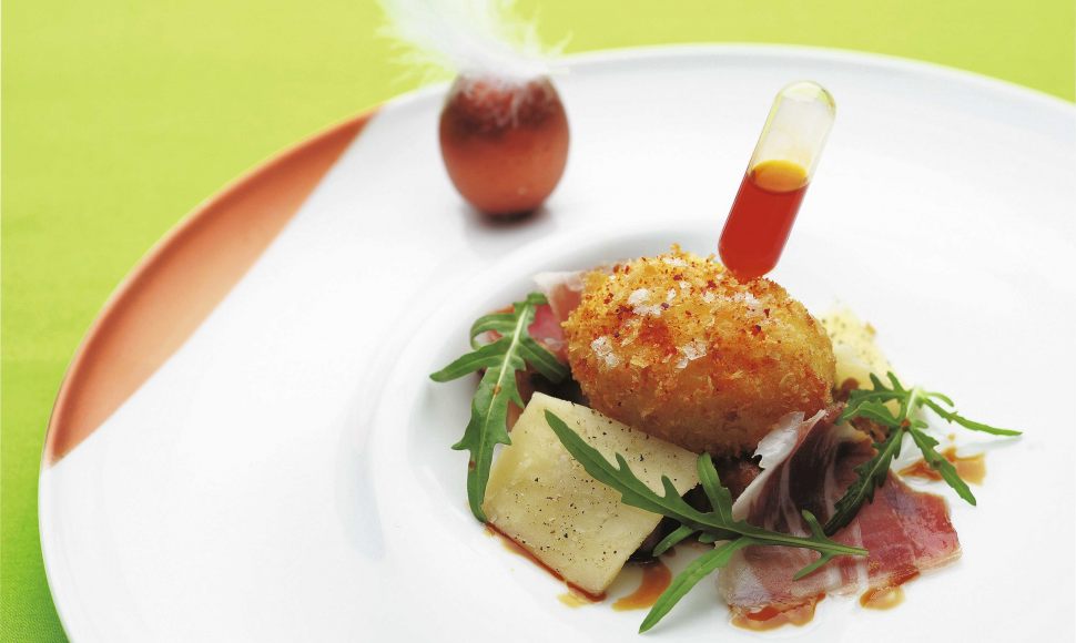 L’œuf frit est mi-cuit, puis piqué d’une « dose » d’huile au chorizo au moment du service ; le jaune d’œuf se mélange à l’huile pour former la sauce du plat.