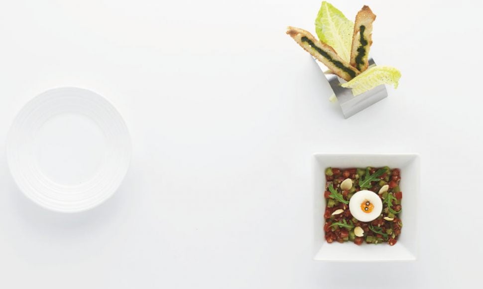 œuf de poule mollet, marmelade tomate-courgette, toast melba et côtes de romaine