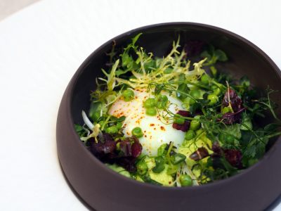 Dans une assiette creuse ajouter la purée de petits pois au siphon puis ajouter l’œuf au milieu. Sortir la salade et assaisonner la avec du sel, poivre et l’huile de basilic la mettre autour de l’œuf pour avoir du volume ajouter les écores de citron confit un coup de moulin et fleur de sel.