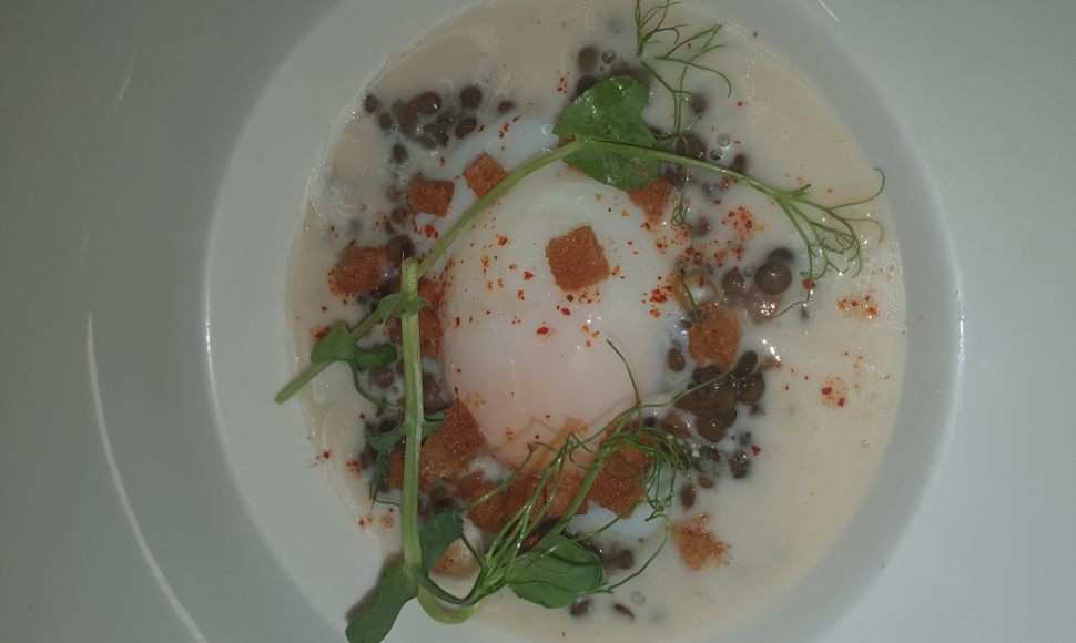 Dans une assiette creuse, disposer les lentilles, ajouter un œuf et verser un filet de crème.