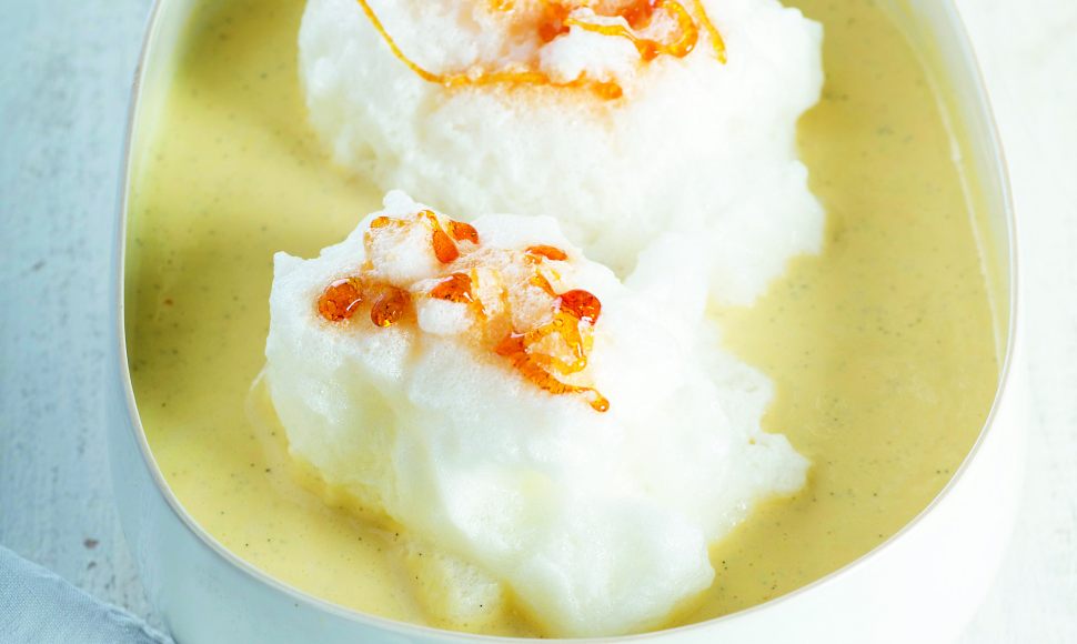 Dans un petit bol ou une assiette creuse, versez 2 louches de crème anglaise vanille, puis disposez 1 cuillérée de blancs montés. À l’aide d’une cuillère à soupe, décorez le dessus des blancs de caramel.