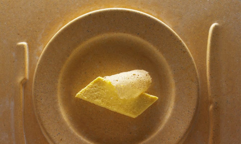 Minorque ayant été sous domination britannique pendant tout le XVIIIe siècle, il reste dans cette île la tradition de cuisiner avec des produits laitiers. Les « Huevos con queso », à mi-chemin entre une sauce et des œufs brouillés, en sont un reflet. Nous les avons revus, reformatés et accompagnés de tuiles de parmesan.