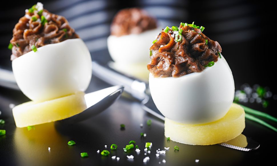 Cuire les œufs pendant 10 à 12 minutes. Les refroidir dans de l’eau froide et les écaler. Couper les chapeaux et séparer tout doucement le jaune du blanc. Rincer les blancs d’œufs et les laisser s’égoutter sur un linge propre à l’envers.