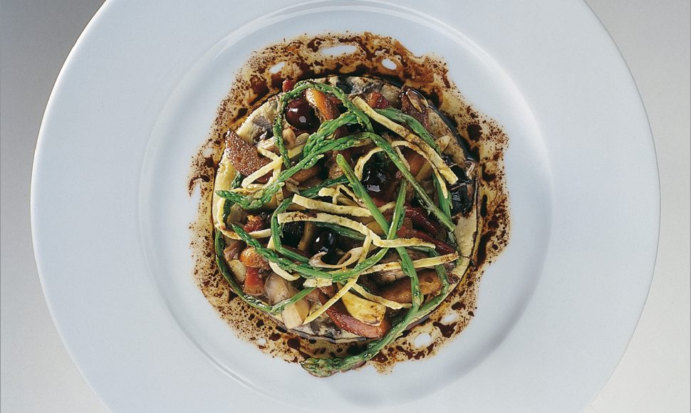 œufs de poule en omelette cassée à la fourchette, asperges sauvages et perce-neige, jus de rôti