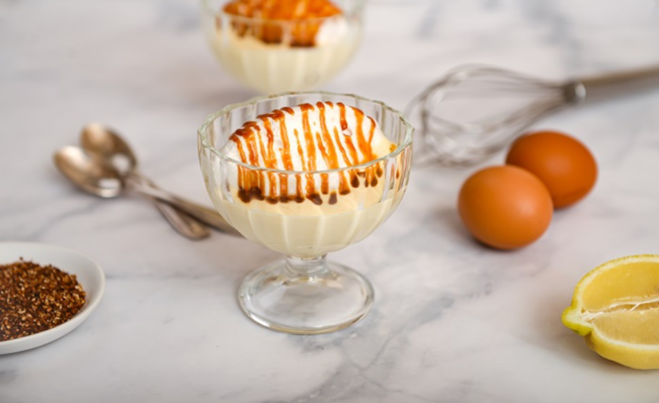 Oeufs Label Rouge en île flottante, crème anglaise au sarrasin, caramel citronné