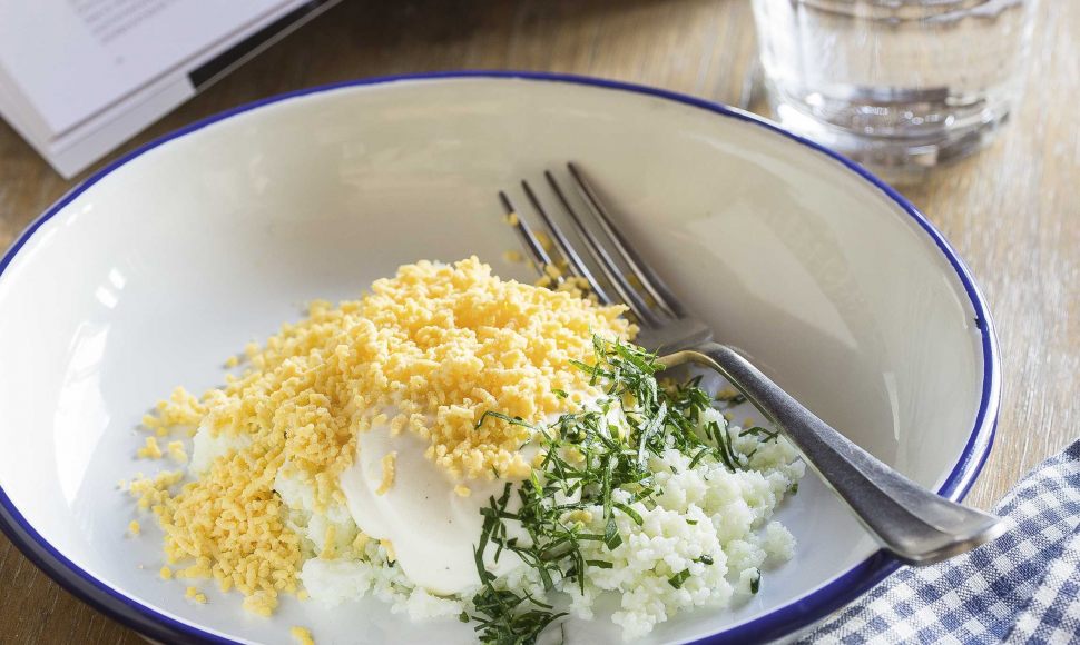Assaisonnez les blancs d’œufs tamisés avec l’huile d’olive, le piment d’Espelette, le sel et la verveine hachée. Déposez-les dans le fond de petites assiettes creuses. Ajoutez la mayonnaise allégée, puis terminez avec la poudre de jaune d’œuf.