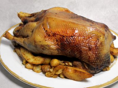 Saler et poivrer l’intérieur et l’extérieur de l’oie. Réserver au frais. Préchauffer le four à 180°C. Déposer toute la farce à l’intérieur de l’oie en la répartissant bien jusqu’au fond. La brider en recousant bien l’ouverture. La badigeonner de graisse d’oie et la déposer dans un plat. L’enfourner pendant 2 heures en l’arrosant fréquemment et en la retournant plusieurs fois.