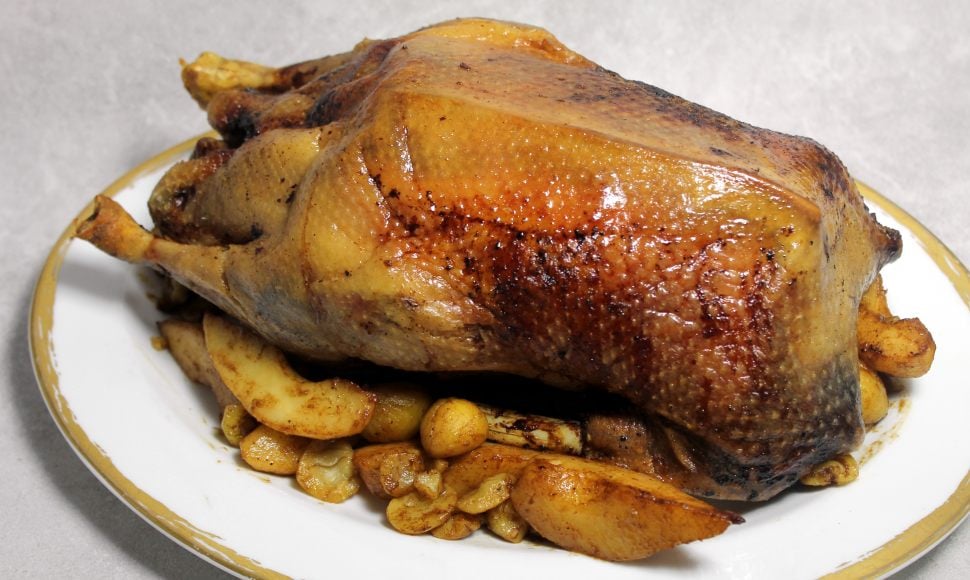 Les mariages salés / sucrés font bon ménage durant les fêtes de fin d'année. Nous vous proposons une oie farcie aux pommes, accompagnée d'une savoureuse garniture aux marrons et aux poires. Les fruits sont dorés au beurre puis flambés au Calvados. Dans cette recette idéale pour un repas de Noël, l'oie peut-être remplacée par une poularde ou un chapon, il vous faudra juste adapter la cuisson de la volaille.