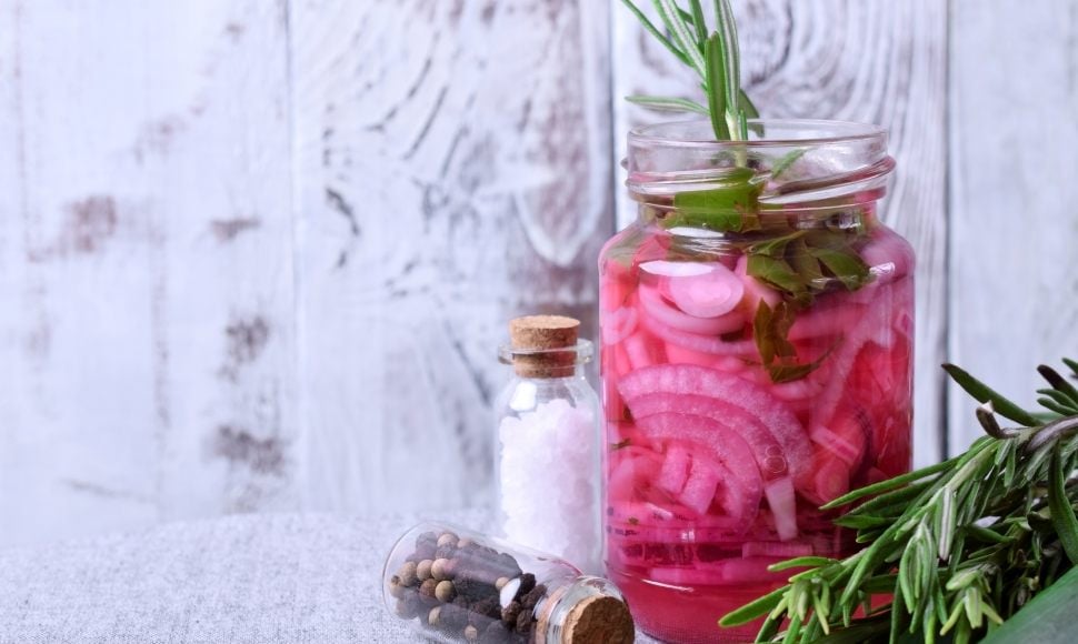 Épluchez l’oignon, puis coupez-le en quatre. Mettez-le dans un bol, ajoutez le vinaigre, le thym, le laurier et le sel, puis couvrez de film alimentaire. Laissez mariner pendant au moins 1 nuit.